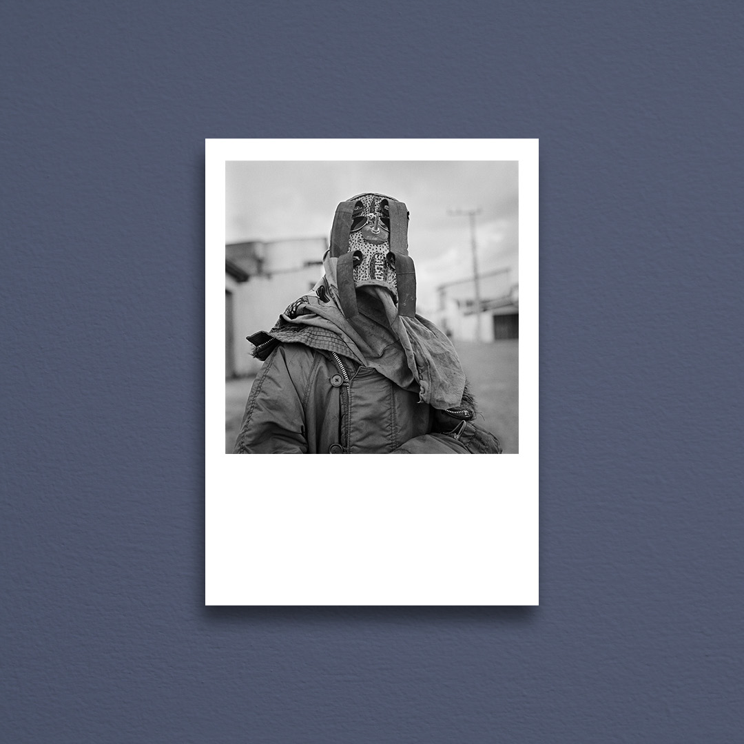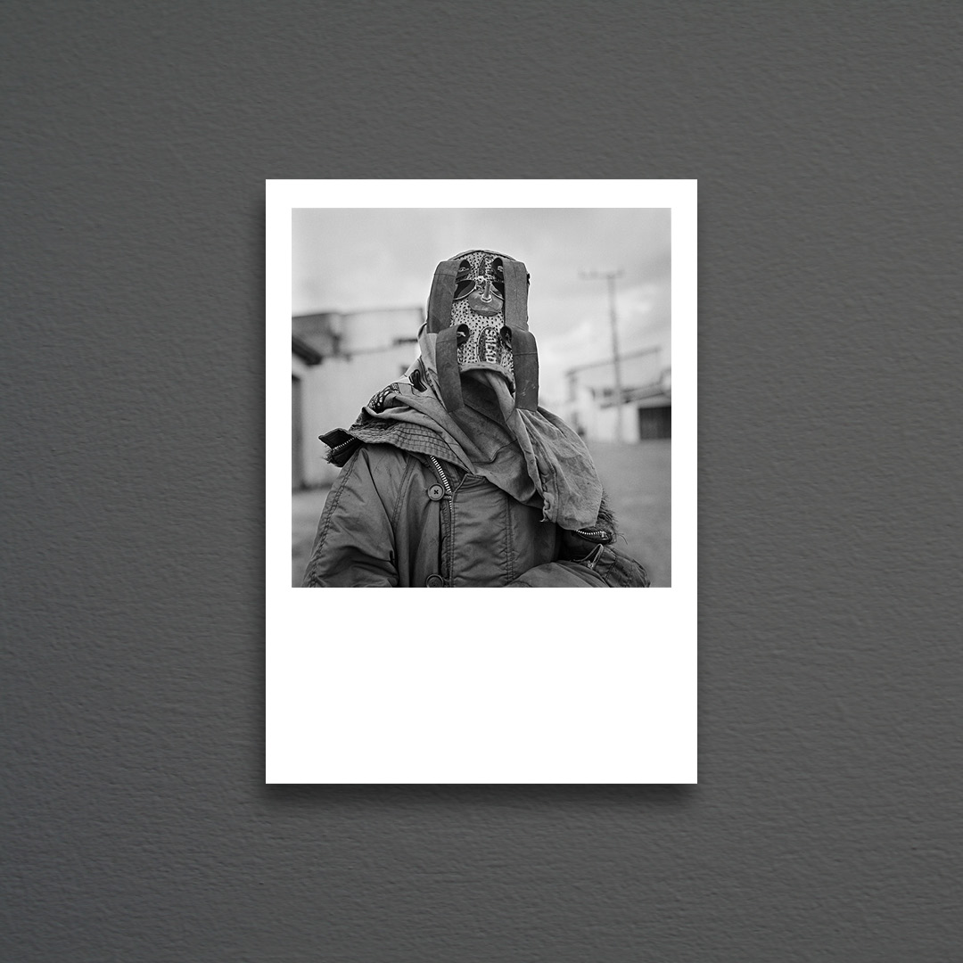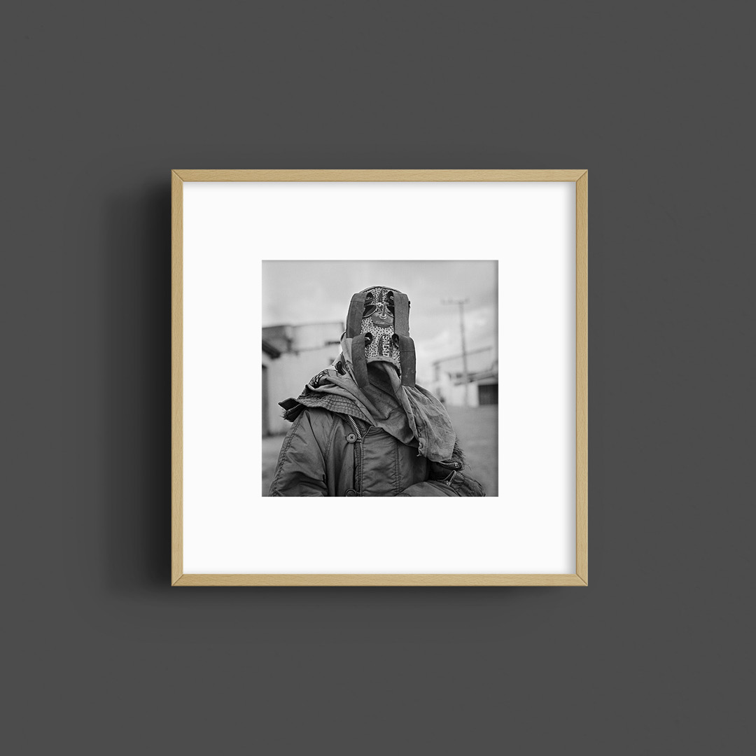 The image was shot under the soft, diffused light of a typical overcast July sky on the northern coast of Bahia. Captured with a Hasselblad using the legendary 80mm lens, the framing offers the poise and stature of a classical painting. The subject is a “Careta”—a local tradition where children and young men mask themselves completely to roam the streets, balancing a sense of mystery with the stark reality of the landscape.